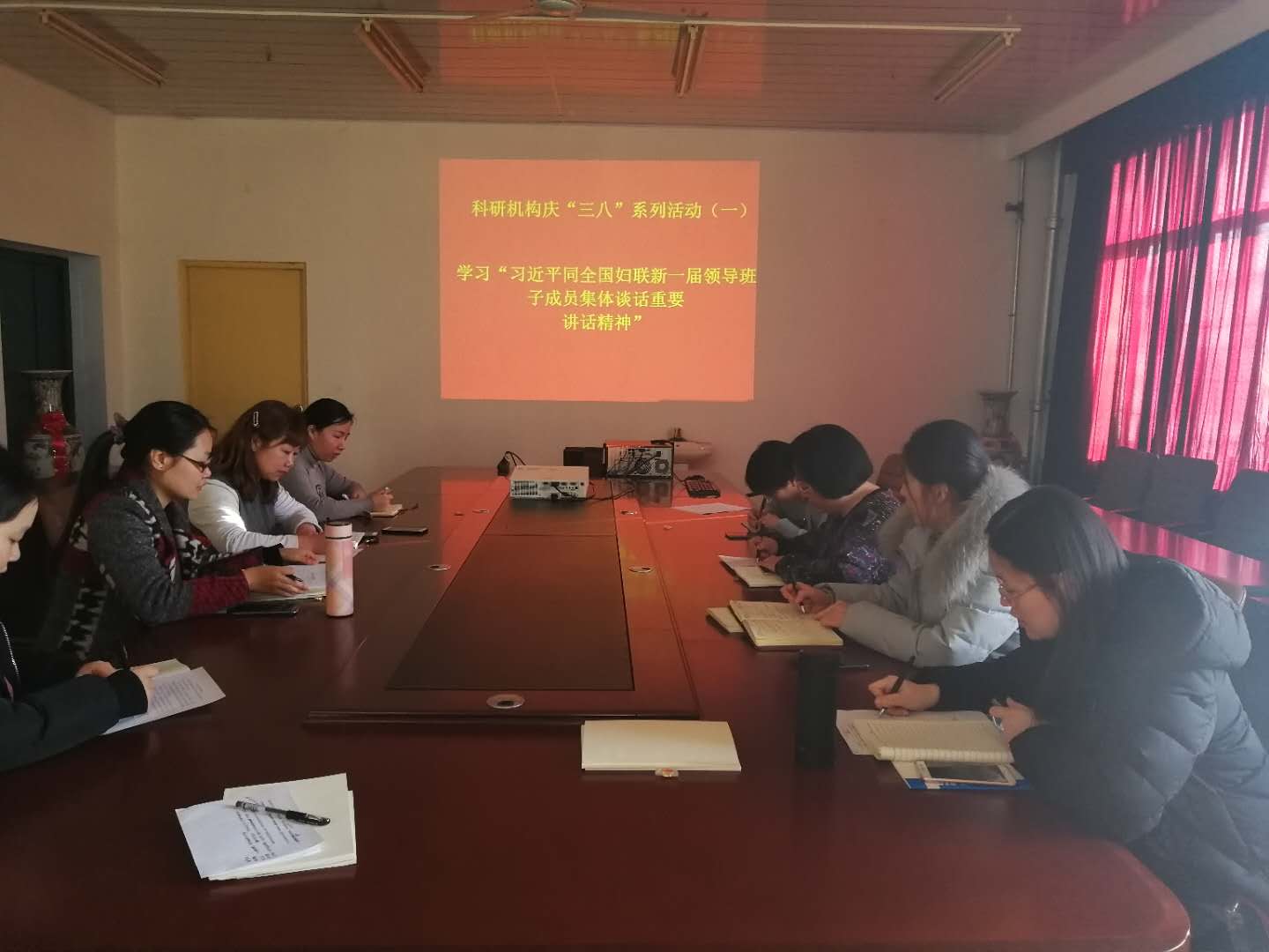 活动分为理论学习、座谈、文体活动三个环节。理论学习环节,学习了习近平总书记在同全国妇联新一届领导班子成员集体谈话时的重要讲话精神、《山东省反家庭暴力条例》和《山东省女职工劳动保护法》;座谈环节,女教职工们热情高涨,踊跃发言。大家结合工作谈体会,联系生活谈感悟,并纷纷表示作为新时代的女科研工作者,要立足岗位,积极进取。文体活动环节,开展了踢毽子、跳绳等活动,大家积极参加,现场笑声不断。