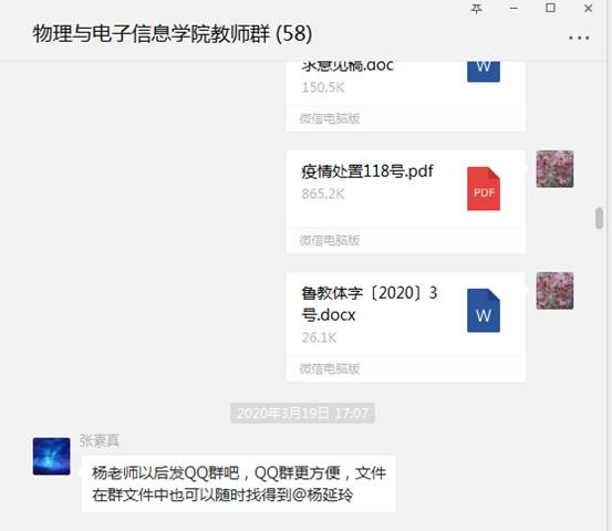 1.组织学习文件。通过工作群向大家转发了《德州学院疫情防控工作应急预案》《山东省高等学校2020年春季学期开学防控新冠肺炎疫情工作指南》《山东省高等学校2020年春季学期开学条件核验细则》《依法防控》(一二三四)以及《山东省高等学校2020年春季学期疫情防控工作指导手册》《德州学院校园出入制度》等学校疫情防控相关制度、文件。