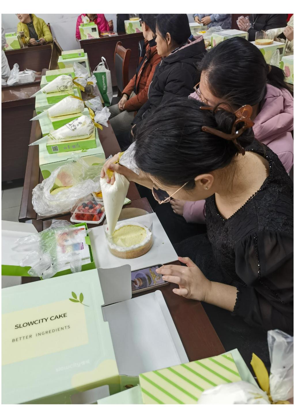 慢城蛋糕店师傅首先进行示范讲解,老师们虚心的学习,耐心的制作,在蛋糕店师傅的指导下,每位老师都完成了自己的作品。品味甜蜜生活,感受幸福味道。
