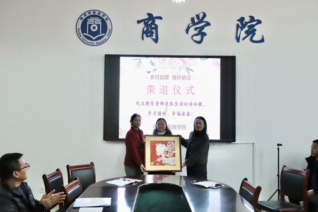 学院领导向王艳芹老师赠送非遗剪纸纪念品。剪纸以“荷花锦鲤”为设计主题,寄托着对王老师今后生活的美好祝愿,学院也欢迎王老师今后继续关注学院发展,有空常回家看看。