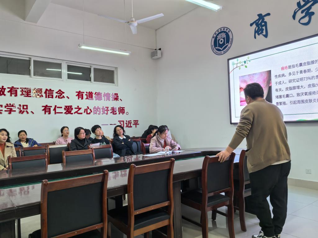 为增强教职工健康管理意识,普及科学护肤知识,3月25日,商学院特邀德州市中医院医学美容中心主任、主诊医师王玉栋走进校园,为全体教师开展了一场题为“科学护肤,健康同行”的专题讲座。活动旨在通过专业医学知识科普,帮助教职工树立正确护肤理念,以更佳状态投入教育教学工作。‌