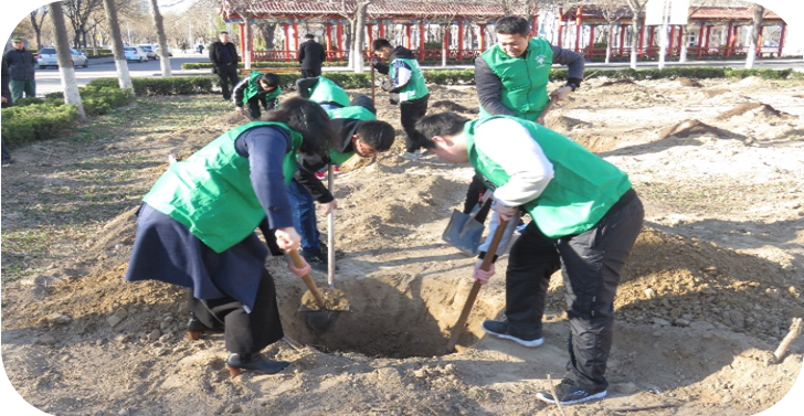 在植树过程中,师生齐动,热闹非凡。师生共赴植树现场后,后勤处老师为我们送来了植树工具与树苗。杨书记给大家详细讲解了一些种植树的技巧和注意事项,然后大家自由分成了五个三人小组开始植树。大家互相配合,纷纷拿起铁锹、洋镐,干劲十足,有的挥锹铲土、有扶树填土,每个人都忙得不亦乐乎。经过三个多小时的劳动,师生志愿者充分发挥专业优势,20多棵银杏树在我校学苑广场“安家落户”,为校园又添一抹春意生机。
