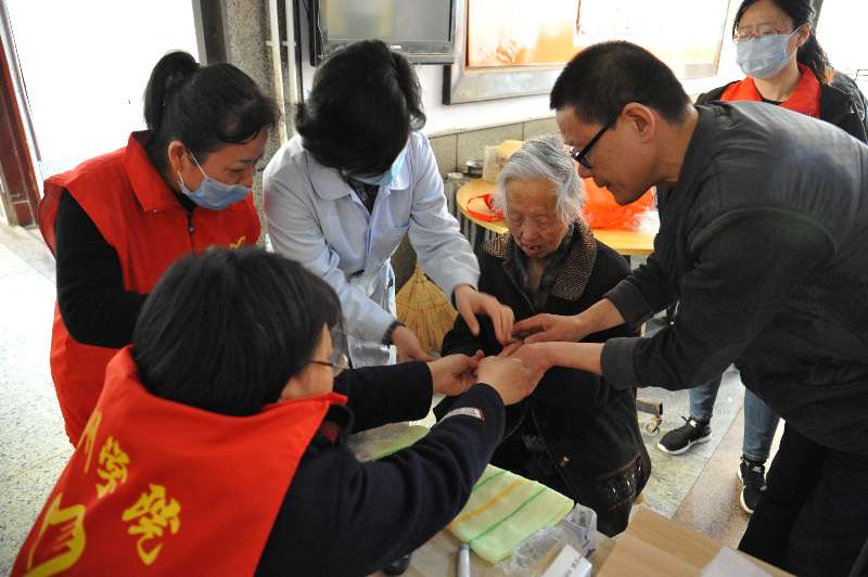 志愿者向老人们宣讲高血压等常见病的症状和防治知识。从疾病的诱发因素切入,着重分析了老年人在选择正规的医药治疗还是保健养生方面的困扰,帮助他们树立正确的健康理念。宣讲之后,志愿服务队成员为社区居民义务测量血压、血糖,并根据测量结果结合用药、饮食情况,有针对性地进行健康指导。