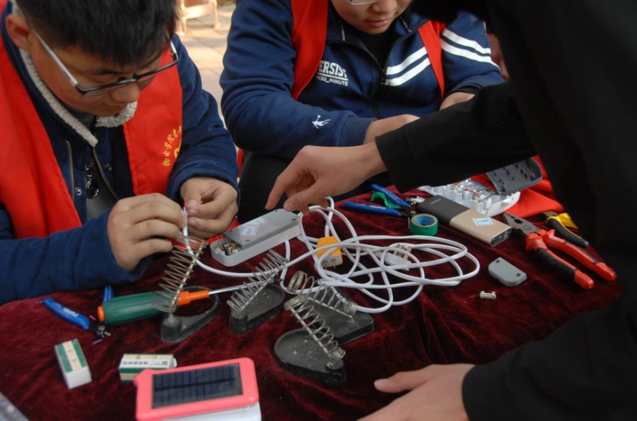 义务维修活动开始后,志愿者分成若干小组在学校人员流动密集的地区进行志愿宣传,吸引了众多师生携带台灯、充电宝、耳机等小电器前来维修。志愿者首先进行维修物品登记,然后维修队成员认真仔细的进行检测、维修,并耐心的进行维修讲解,科普相关科技知识,义务维修活动有条不紊的展开。