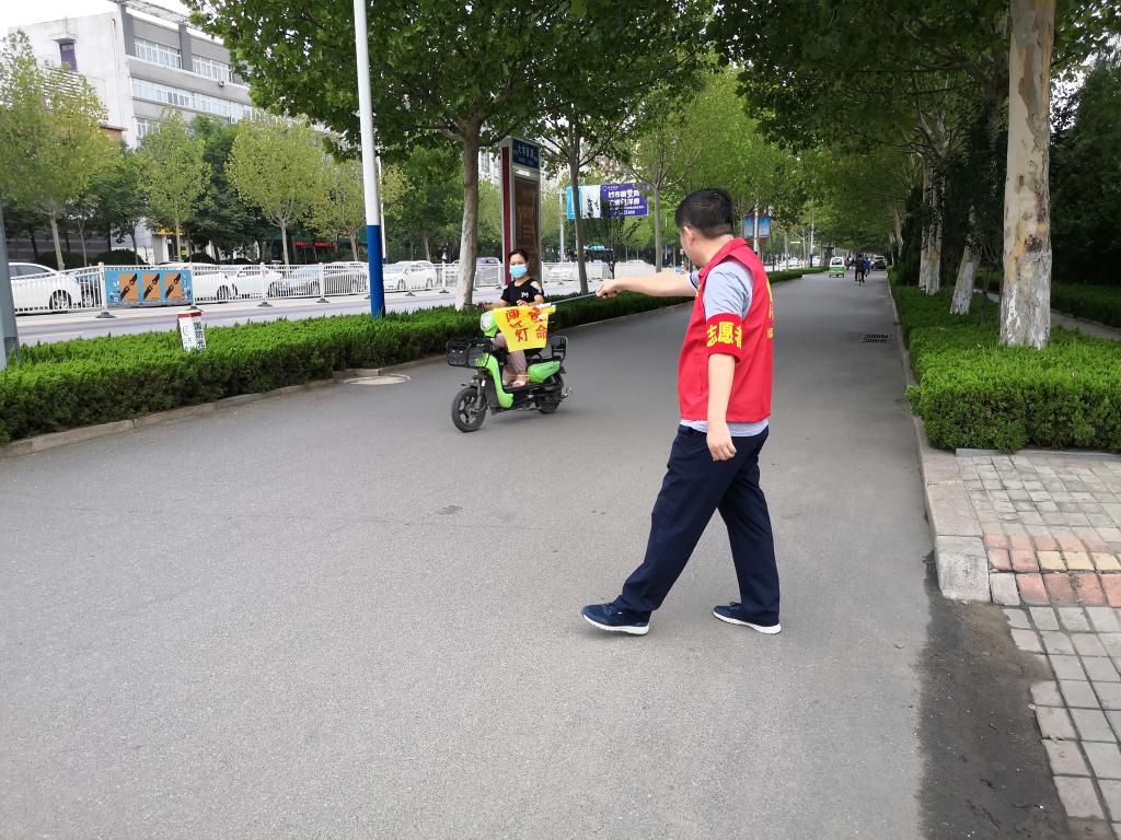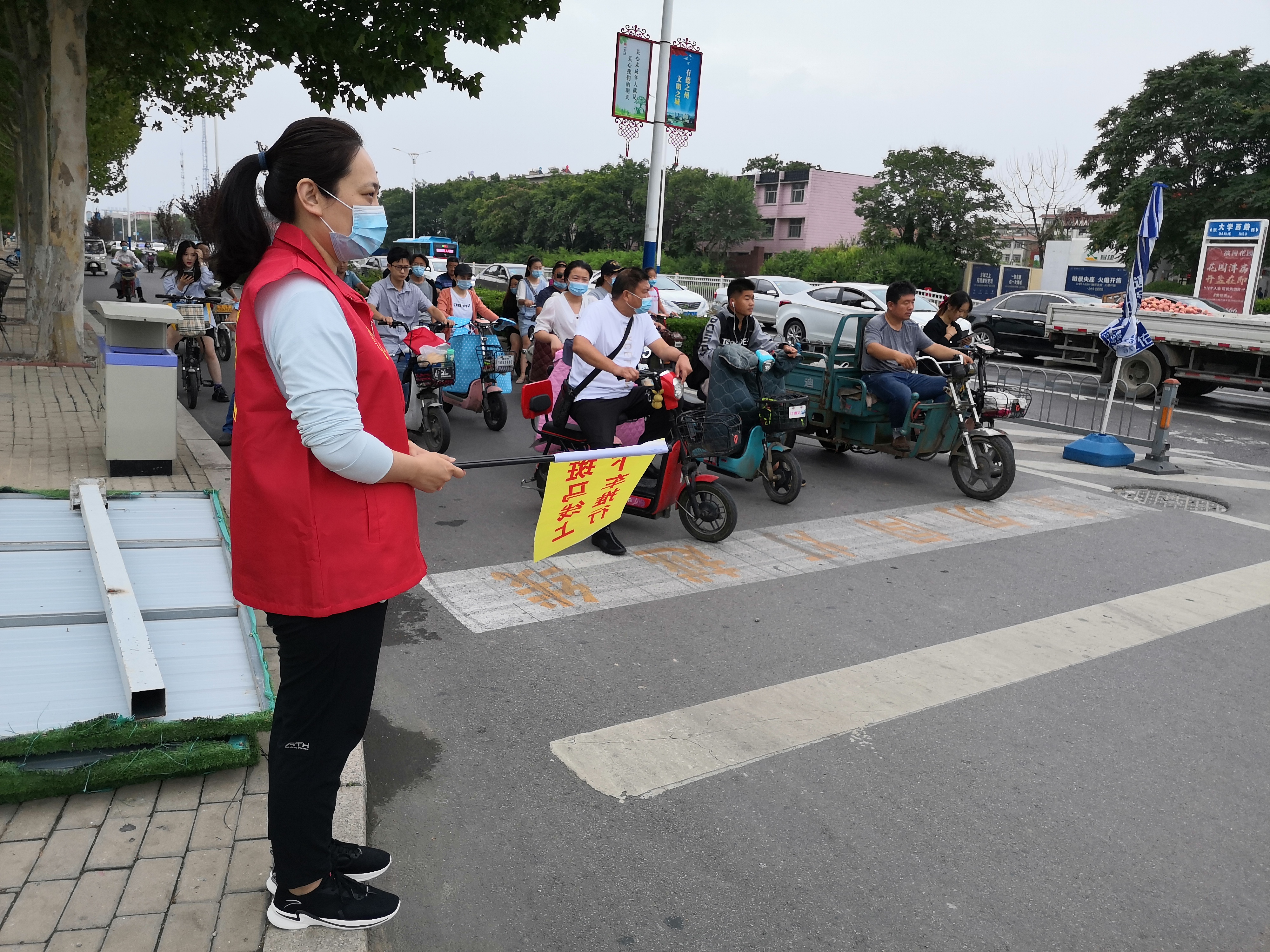 7月13日上午7时30分,在德兴北大道与大学西路交叉口四个街角处,我校8名志愿者身穿红色马夹,手持小黄旗,协助交警制止和劝阻机动车不礼让斑马线、非机动车和行人闯红灯等行为,形成了一道亮丽的风景线。