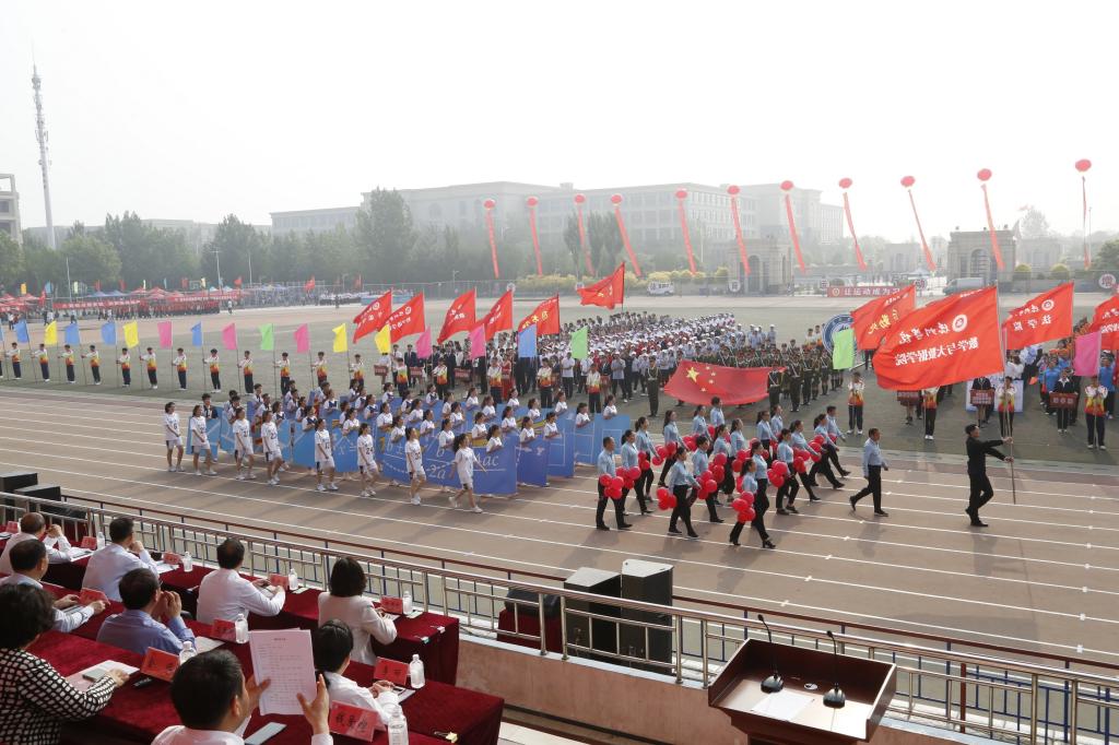 副校长迟沂军致开幕辞。他指出,此次举办田径运动会是学校贯彻新时代教育评价改革总体方案、加强和改进新时代学校体育工作的重要举措,要以这次运动会为契机,不断深化学校体育综合改革,通过体育课、体育锻炼和体育竞赛等方式,让学生享受乐趣、增强体质、健全人格、锤炼意志,培养德智体美劳全面发展的社会主义建设者和接班人。推动校园体育运动蓬勃开展,营造热爱体育、崇尚运动、积极向上的校园氛围,激发创新热情和团队精神,以更加强健的体魄和更为饱满的热情,投入到今后的学习和工作中去,为推动学校事业高质量发展贡献力量。他要求,全体运动员,要精神饱满、斗志昂扬,充分发扬“更快、更高、更强”的奥林匹克精神,安全参赛、文明参赛、规范参赛;全体裁判员,要忠于职守、严守规程、公正裁判,确保比赛的公平、公正;大会全体工作人员,要树立安全第一的意识,热情服务、保障安全;辅导员和班主任老师们,要组织好队伍,维持好秩序,带领同学们文明观赛,为运动员加油鼓劲,营造良好的竞赛氛围。