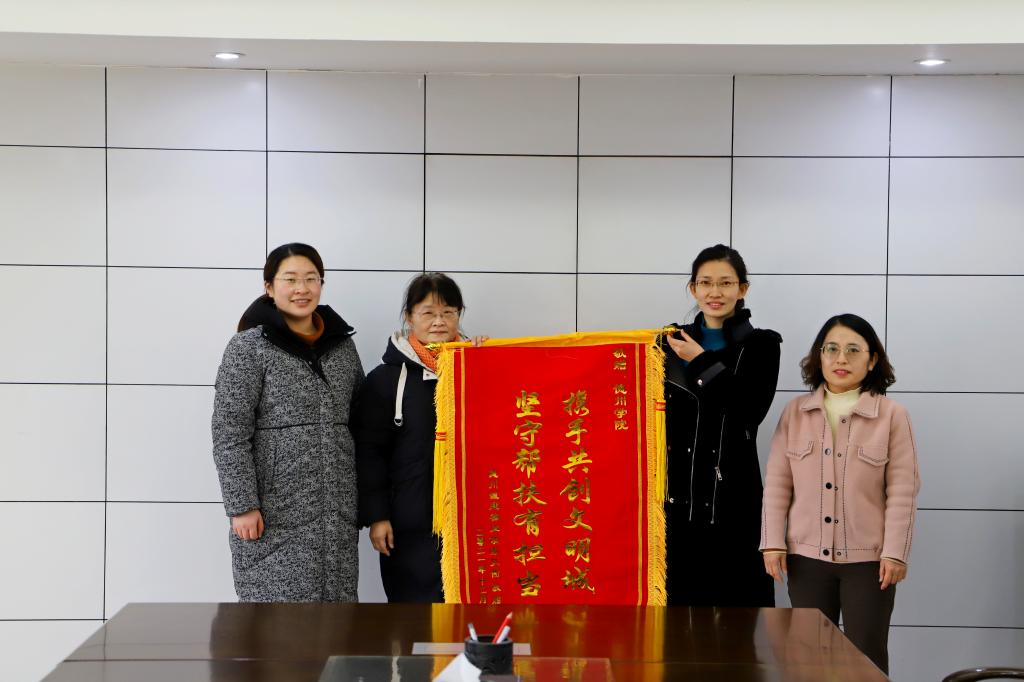 12月29日上午,领秀天衢小区物业代表将一面书写“坚守帮扶有担当 携手共创文明城 ”字样的锦旗送到学校,对学校师生志愿者在国家文明城市创建及迎评期间的暖心帮扶工作表示衷心感谢。赠旗仪式在厚德楼八楼会议室进行,校党委副书记王金利出席。